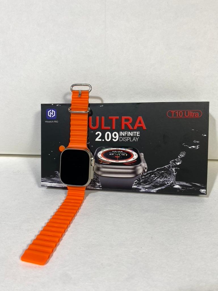 Experience premium features with the T10 Ultra Smartwatch, featuring a big 2.09" bright display, sleek metal body, wireless charging, Bluetooth calling, real activity tracking, and support for all 3G/4G/5G Android phones. Stylish in a vibrant Orange finish.